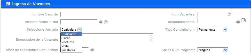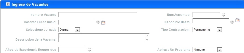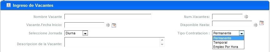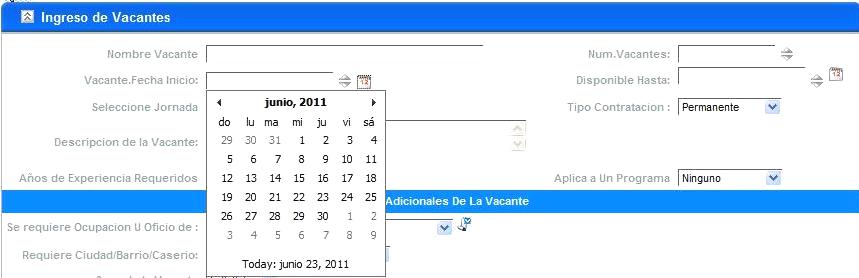 1. Ingrese el nombre de la vacante(conserje), número de la vacante(2), ingrese el inicio y finalización de la fecha de vacantes, Ver uso de calendario .
