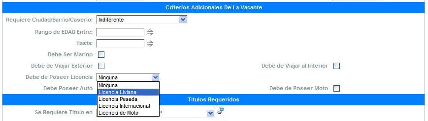 6. Seleccione la cuidad / caserio, el rango de edad, si debe ser marino etc. llene los requisitos que desea para su vacante.