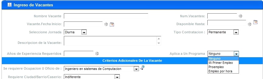 5. De clic en aplicar a un programa si aplica y seleccione un programa; si no aplica a un programa dejelo en ninguno y continué con el registro de vacante.